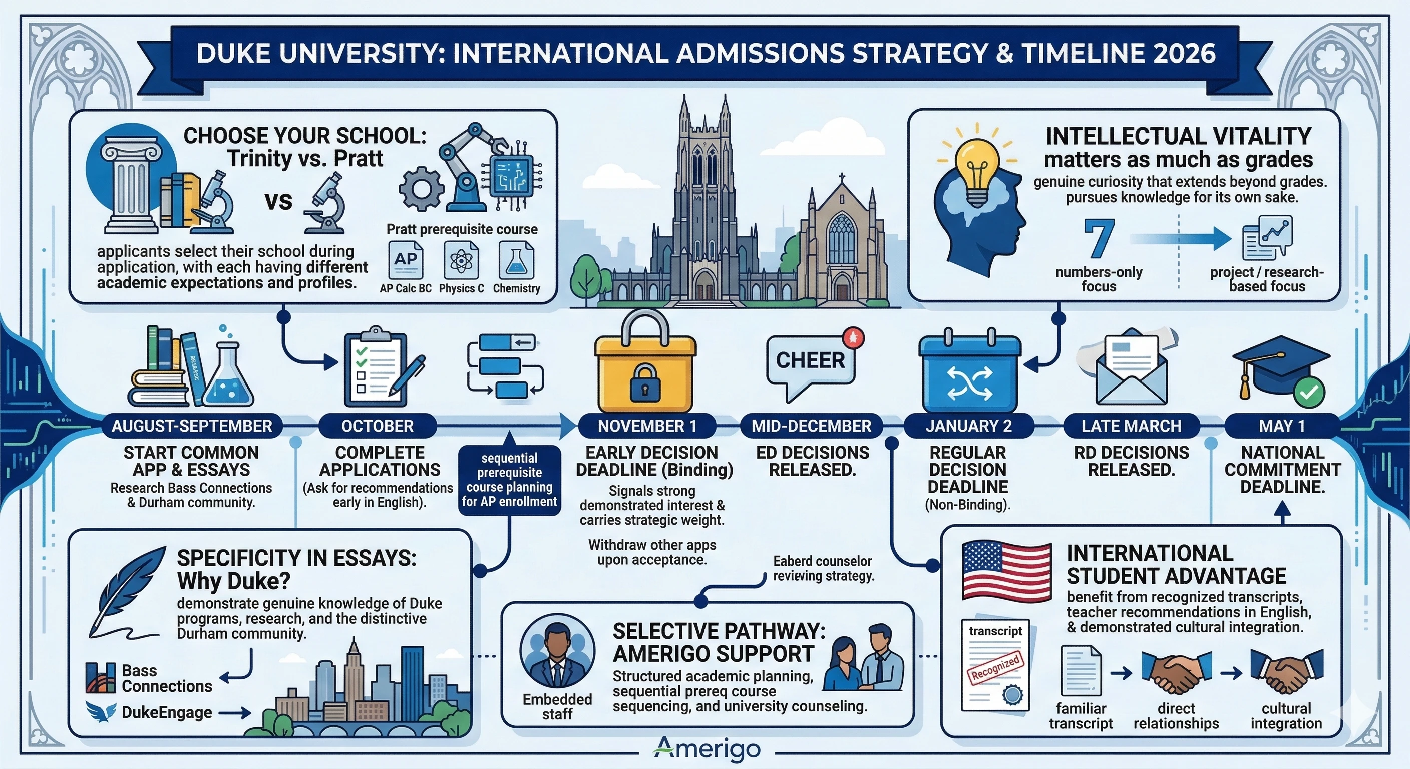 Students attending US high schools gain advantages through recognized transcripts, direct teacher recommendations, and demonstrated cultural integration. Programs like Amerigo that provide four-year academic planning, prerequisite course support, and structured university counseling help international students build the profiles selective universities like Duke expect.