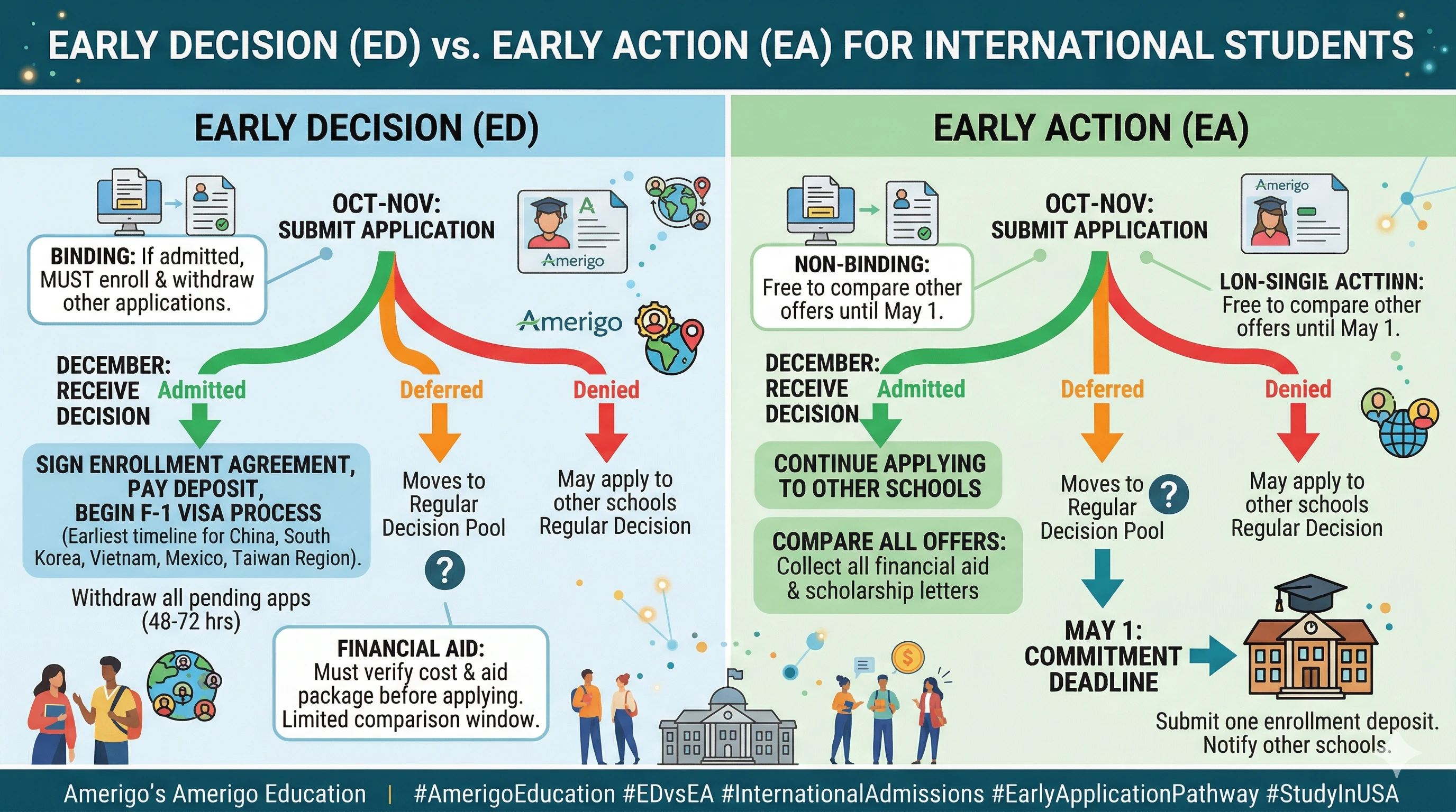 Early Decision vs Early Action for international students: binding vs non-binding differences, F-1 visa timing, financial aid implications, and how Amerigo counselors guide the choice.