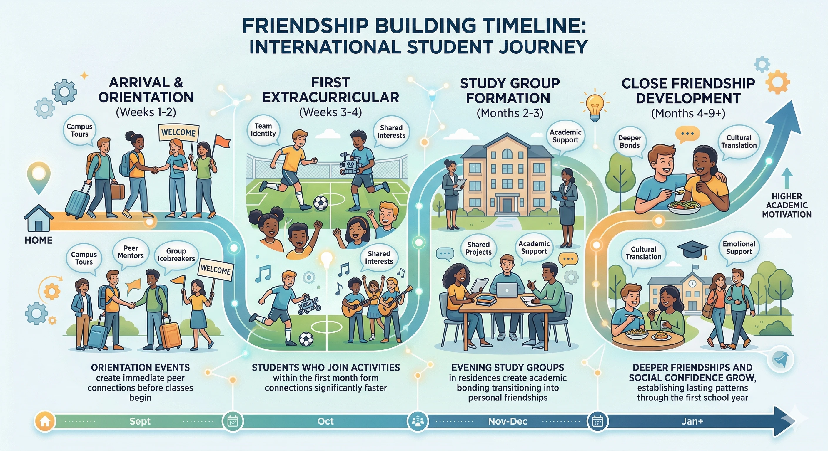 International students build friendships at US high schools through extracurricular participation, residential proximity, shared academic experiences, and structured support from on-campus staff. English proficiency shapes the timeline but does not determine social success. Schools with dedicated international student support infrastructure provide the orientation events, staff monitoring, and activity programming that accelerate friendship formation during the critical first semester.