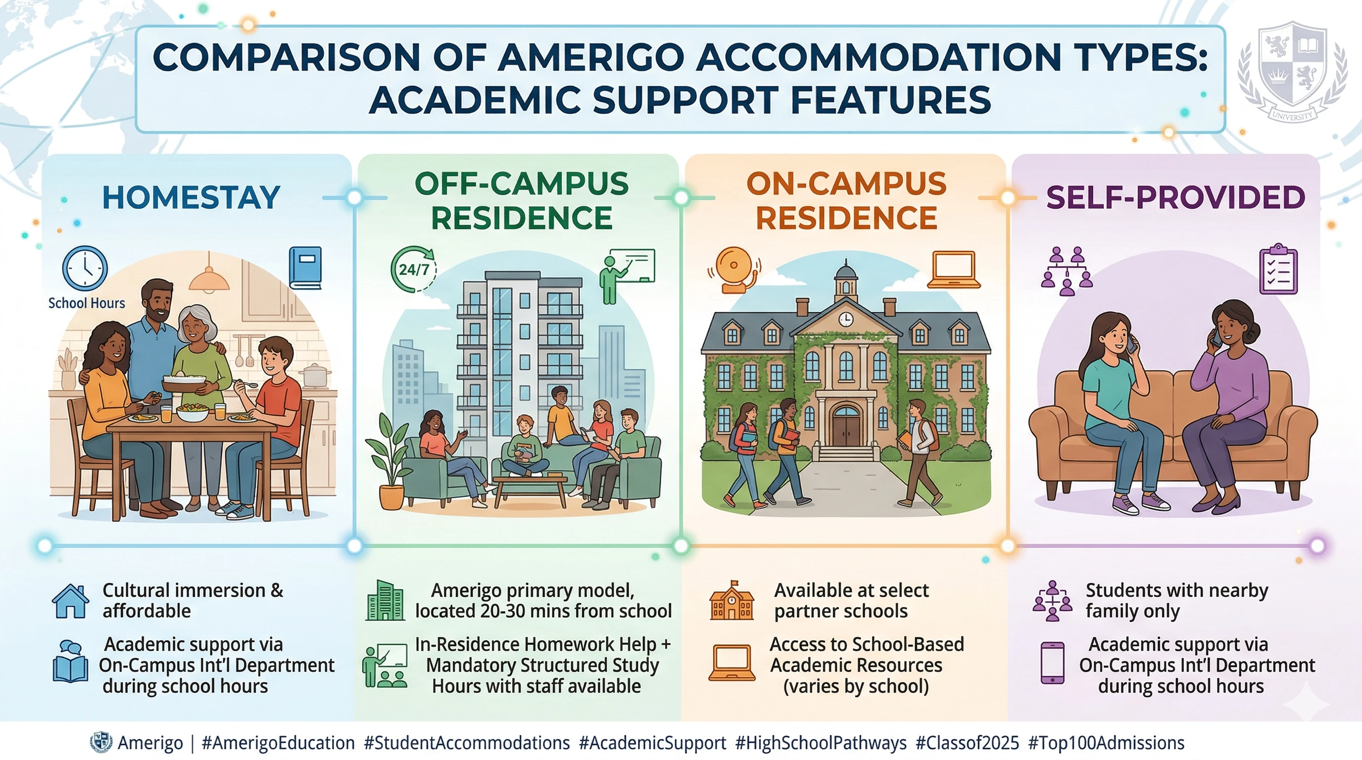 Amerigo offers four accommodation options: homestay, off-campus residences, on-campus residences at select partner schools, and self-provided accommodation for students with nearby family. Each comes with a different academic support structure. Off-campus residences offer 24/7 staff and in-residence homework help. Homestay students access support through the on-campus international department. Families should discuss which option best fits their student's learning style and support needs with an Amerigo advisor.