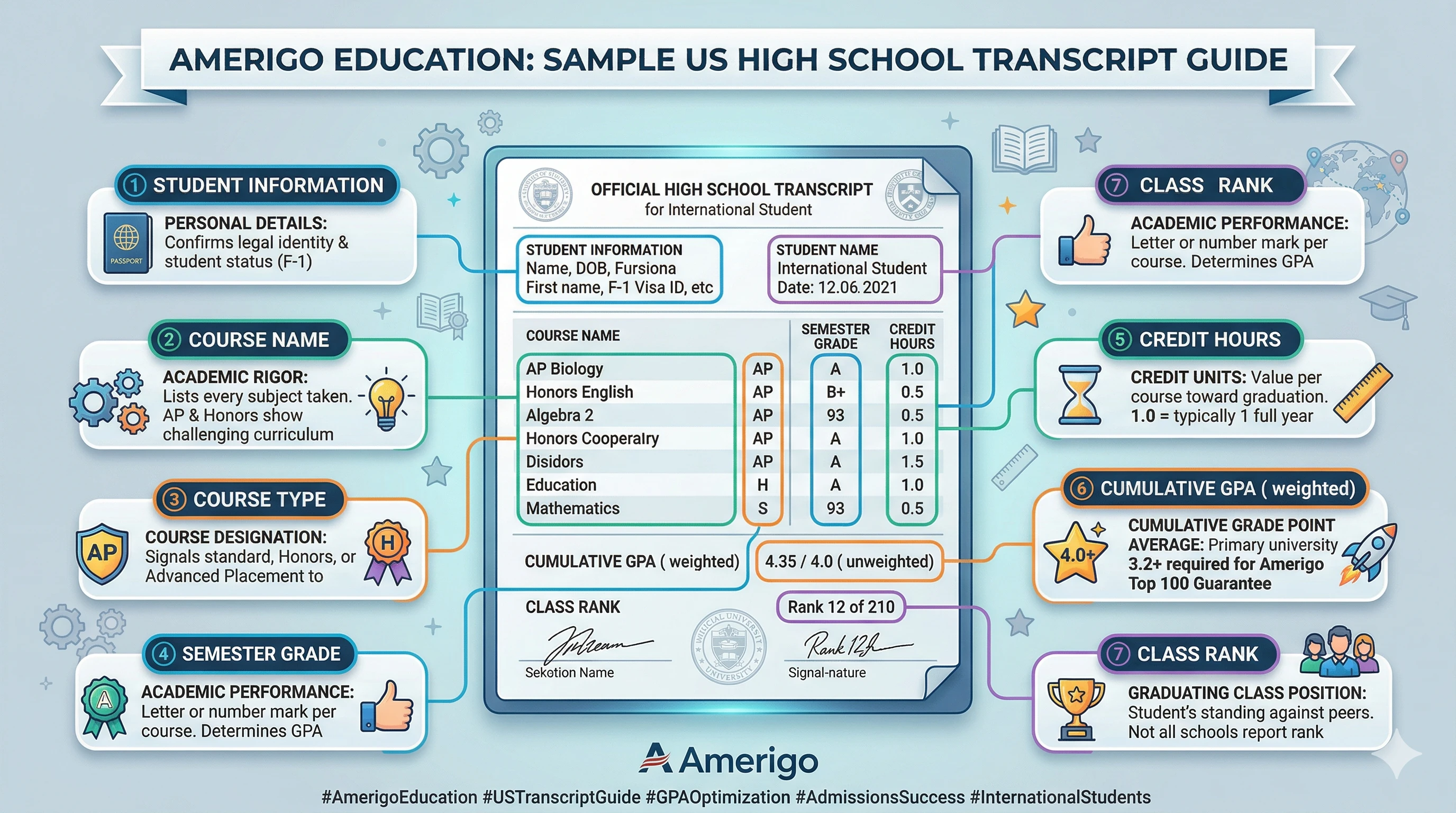How to read a US high school transcript: GPA calculation, weighted vs unweighted grades, AP course weighting, credit hours, and how Amerigo facilitates transcript transmission to universities.