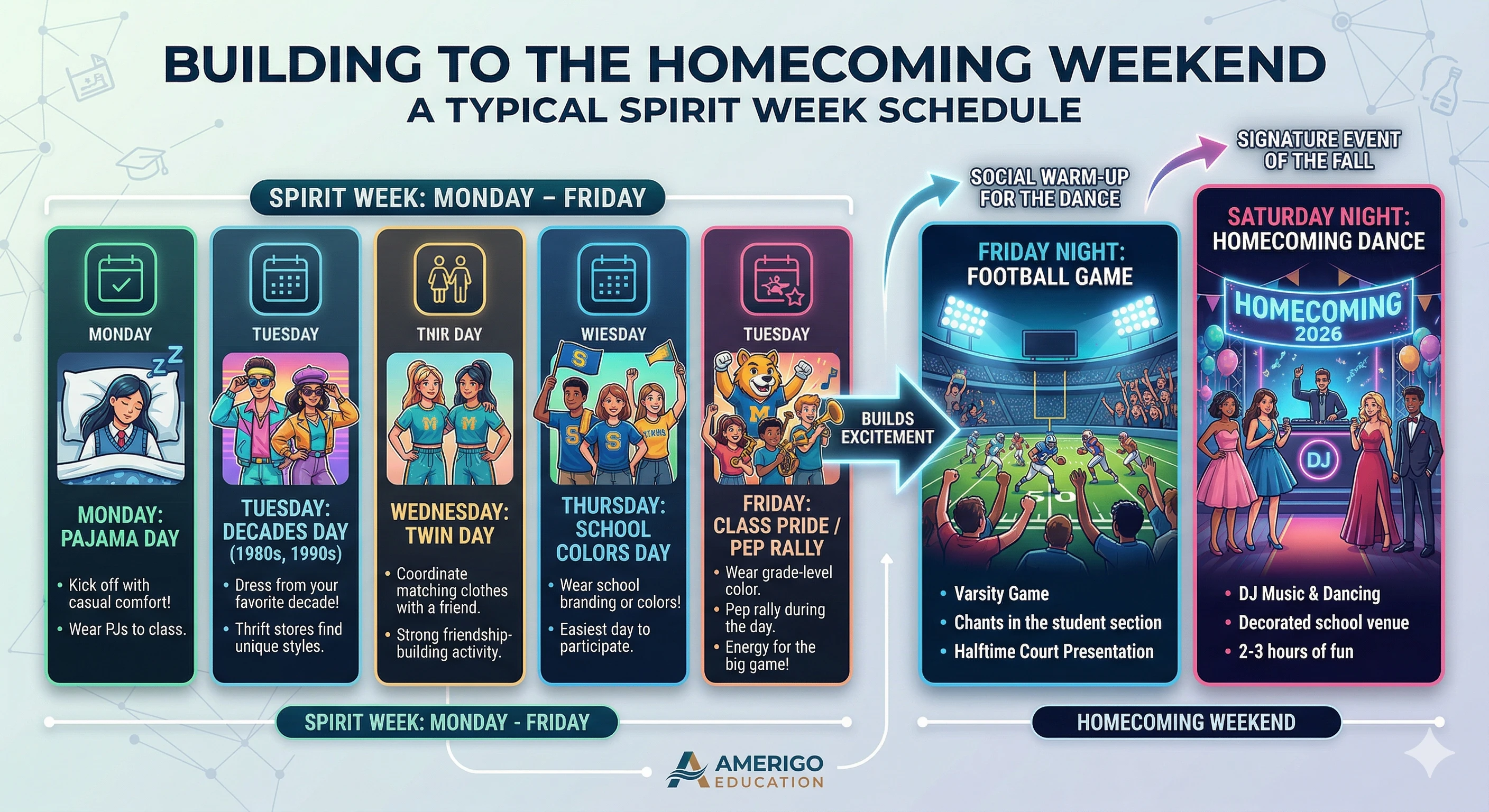 Each day carries a different dress-up theme announced by the student council. Common themes include pajama day, decades day (dressing in 1970s, 1980s, or 1990s styles), school colors day, twin day (matching outfits with a friend), and career day. Participation is voluntary, and students can join some days and skip others without any consequence. The week usually ends with a pep rally in the gymnasium where the marching band performs, cheerleaders lead chants, and student competitions between grades generate energy before the big game.
