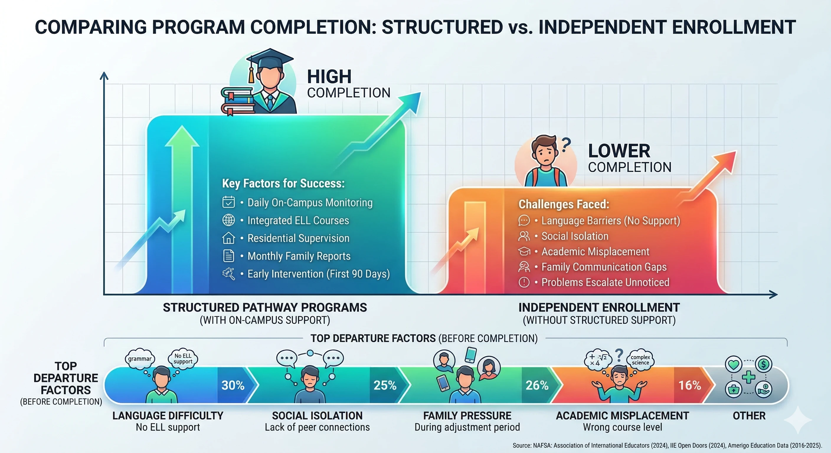 No single published dropout rate exists because completion varies significantly by program type, support level, and student profile. Self-arranged placements without institutional support tend to have higher departure rates than structured programs. Students enrolled in pathway programs with ELL support, residential supervision, and academic monitoring are better supported to complete the full program.