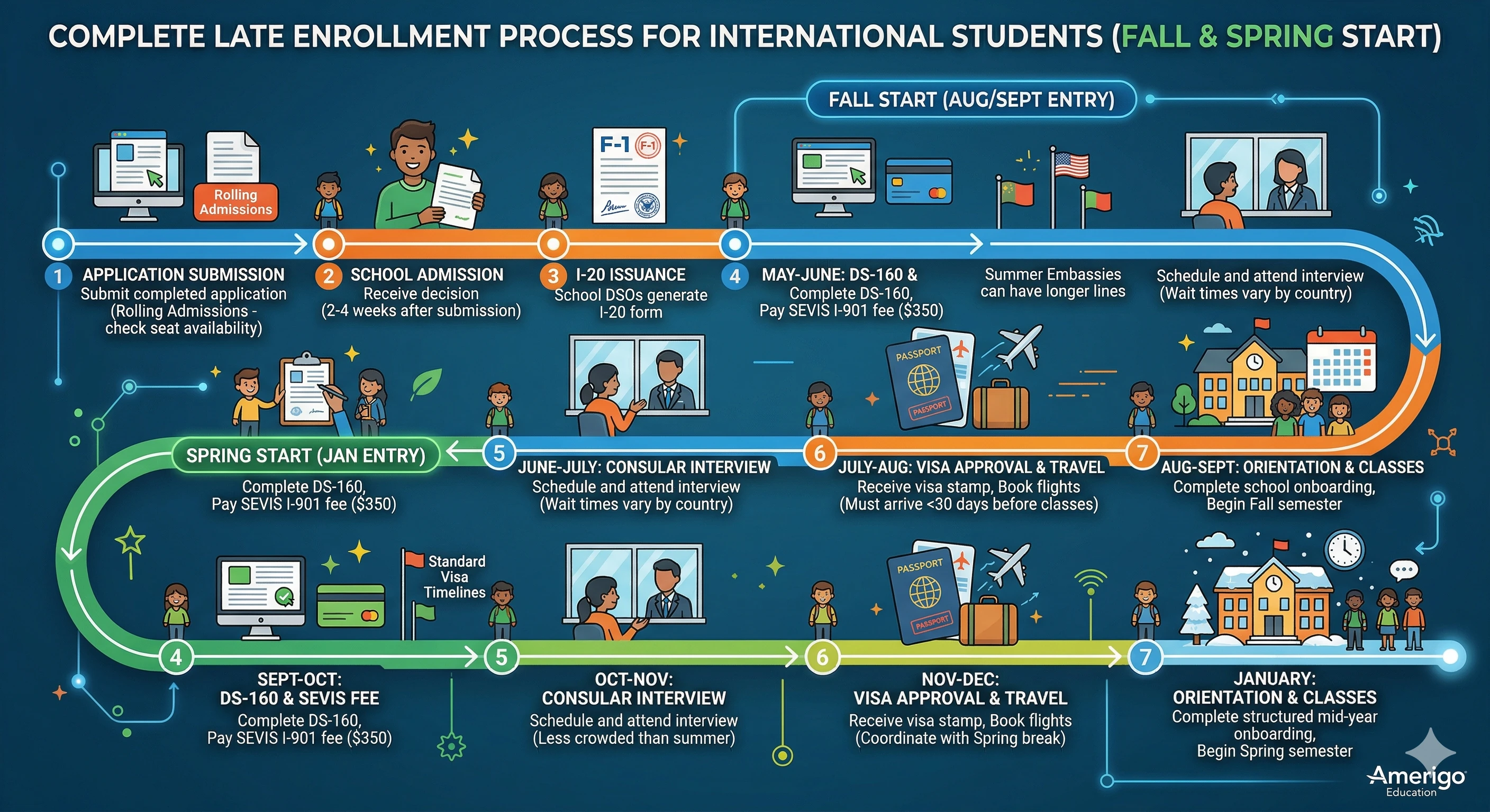 - Visa processing is the true timeline constraint: The F-1 visa process requires at least four months from application to approval, making this the factor that determines whether a late application results in enrollment.