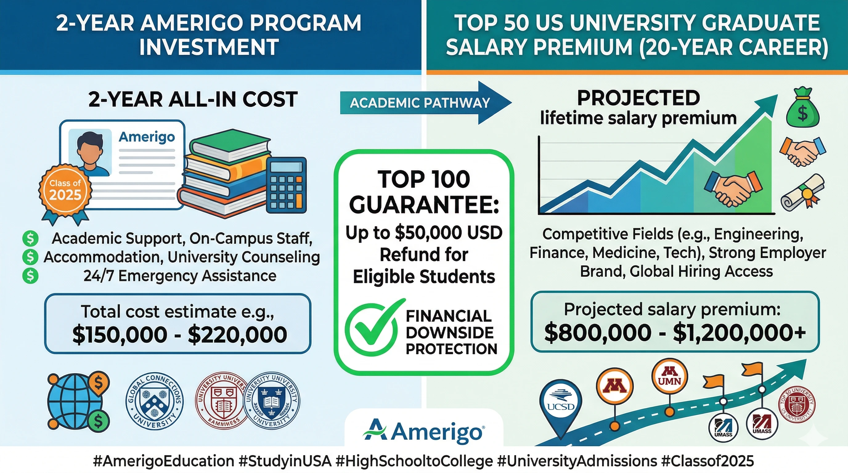 The Top 100 Guarantee is Amerigo's formal commitment that eligible students who meet all program requirements will receive a Top 100 university offer, or receive up to $50,000 USD back in tuition fees. It is the closest thing to financial downside protection that exists in international high school education.