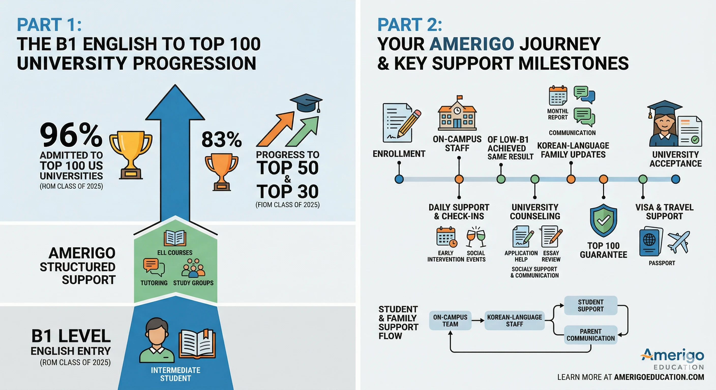 - 96% of B1-level English students reached Top 100 universities: Korean students who arrive with intermediate English can achieve competitive university outcomes through Amerigo's structured academic support.
