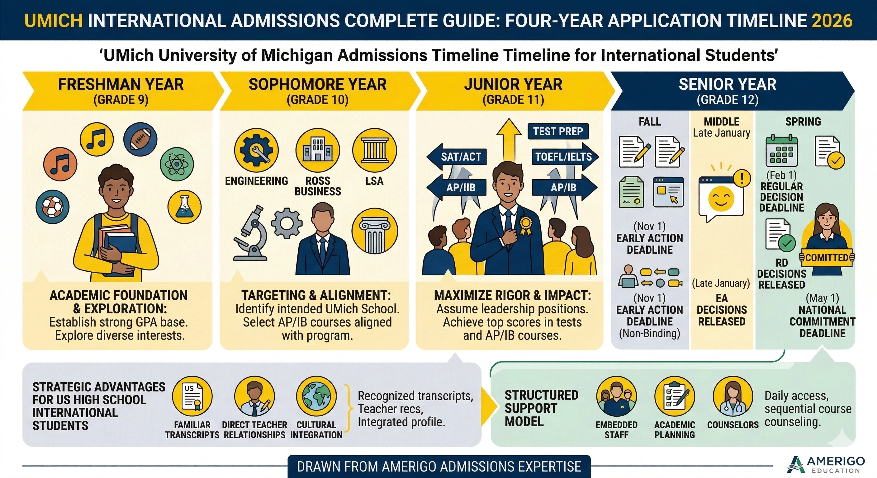 Students attending US high schools gain advantages through recognized transcripts, direct teacher recommendations, and demonstrated cultural integration. Programs like Amerigo that provide four-year academic planning, prerequisite course support, and structured university counseling help international students build the profiles selective universities like Northwestern expect.