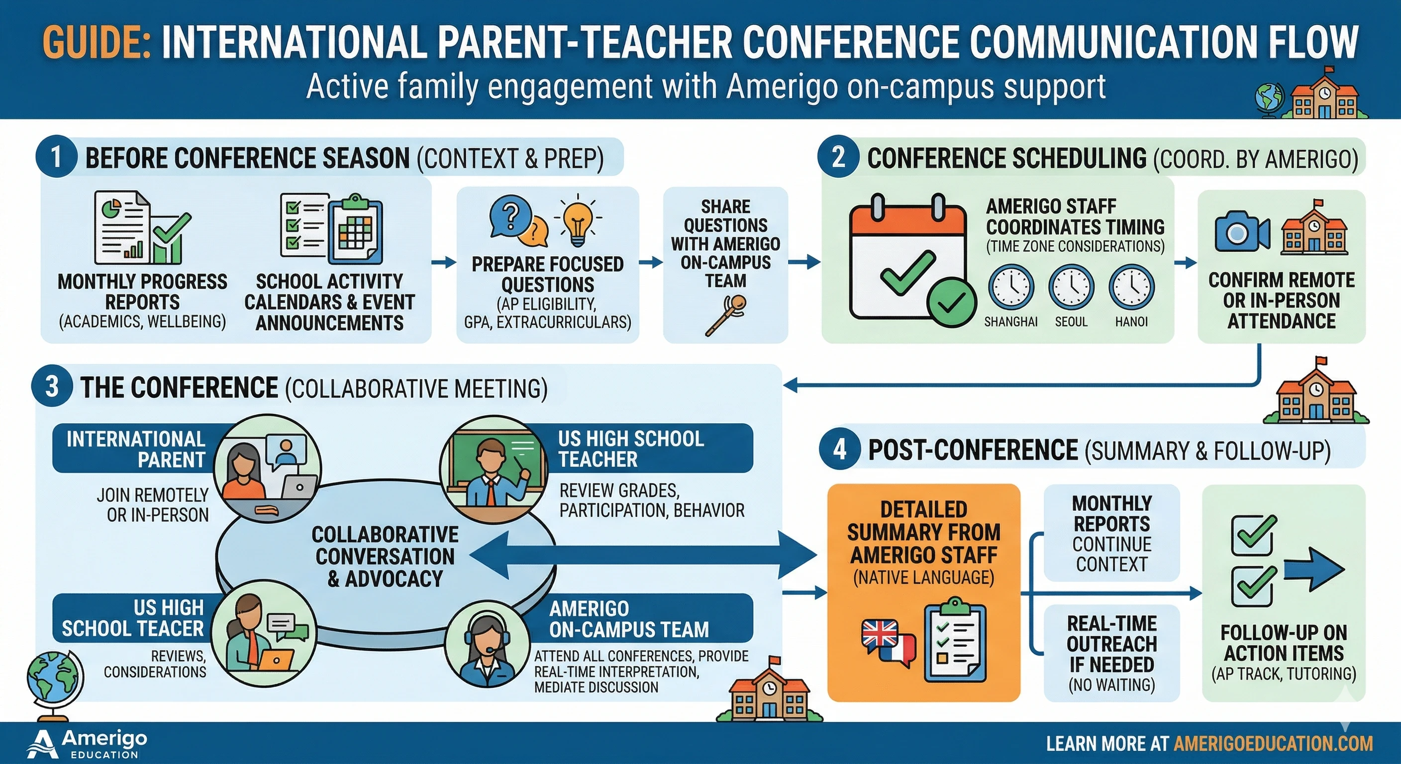 - Amerigo's on-campus team attends every conference and follows up with families: The on-campus staff attend each conference for enrolled students and provide a post-conference summary. Amerigo's in-country staff in China, Vietnam, Korea, Mexico, the Taiwan Region, and more communicate with families in their native language before and after the conference.