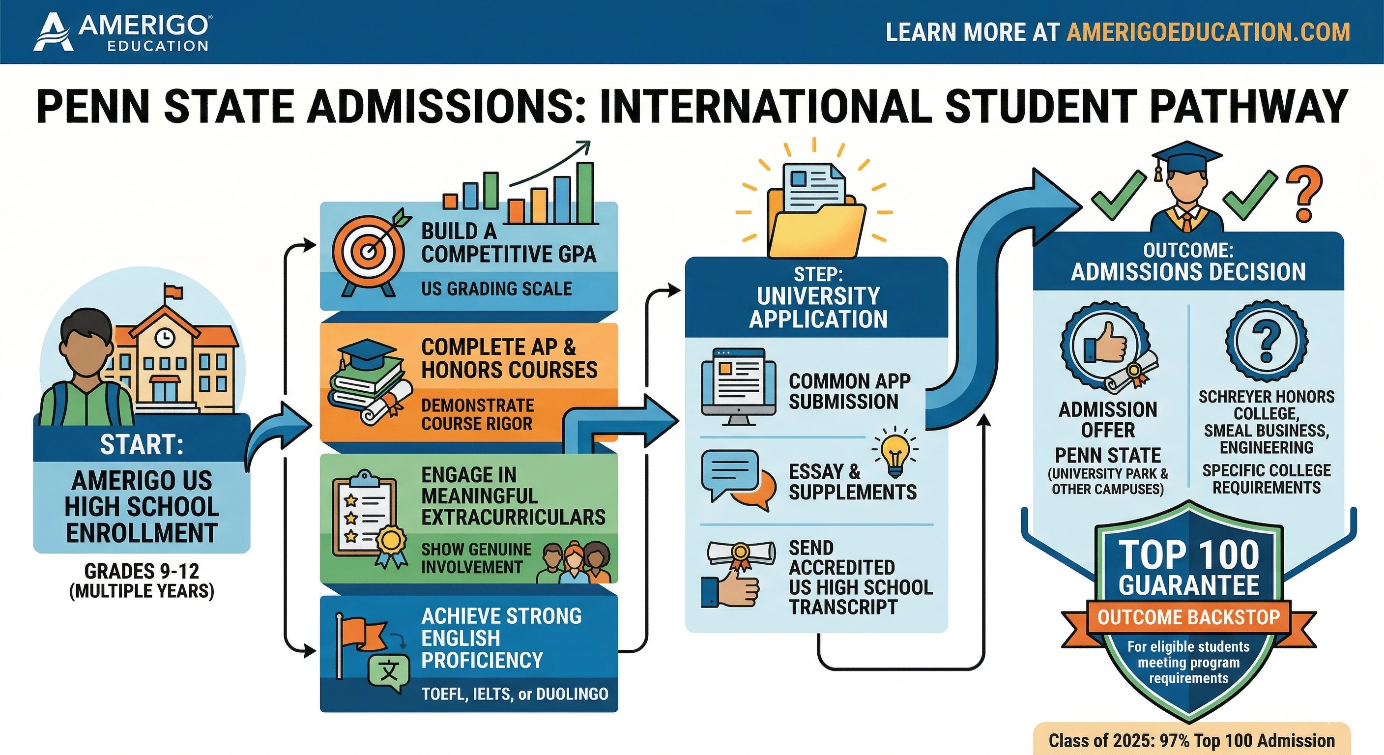 - Penn State is a Top 100 US university: It consistently ranks in both the US News National Universities rankings and the QS Top 100 Global rankings, making it an eligible destination under Amerigo's Top 100 Guarantee for qualifying students.