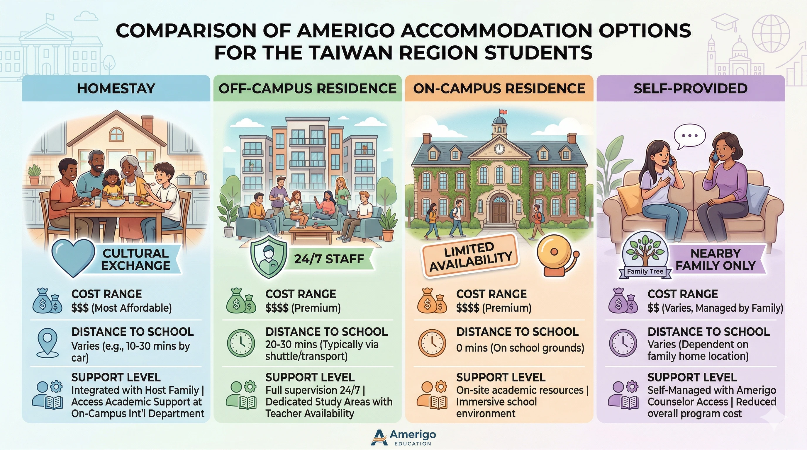 Student accommodation at Amerigo programs is available in four forms. Families from the Taiwan Region should review all options before making a decision, as each model offers distinct advantages depending on the student's preferences and circumstances.