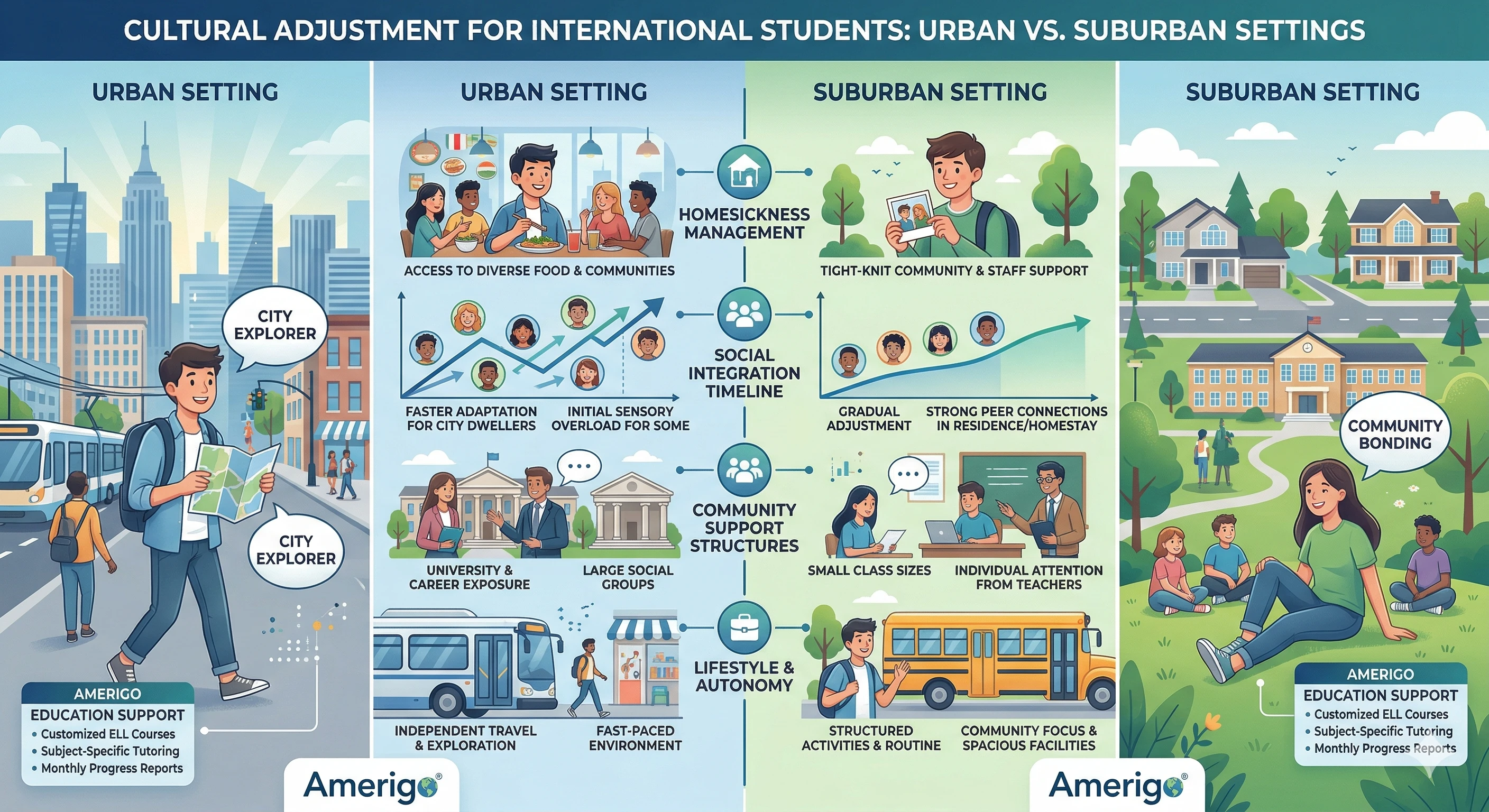 Urban and suburban US high school settings each offer distinct advantages for international students without one being universally superior. Academic quality, university outcomes, and Amerigo Education's standardized support infrastructure remain consistent across both settings. The decision rests on matching the student's personality, lifestyle preferences, and university goals to the environment where they will adjust and thrive most effectively.