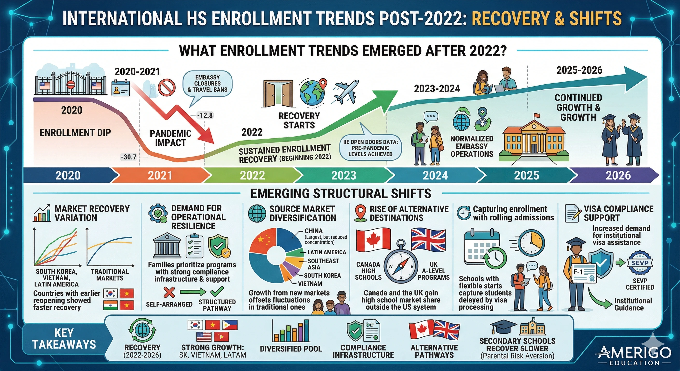 US immigration policy changes between 2020 and 2026 significantly affected international high school enrollment through embassy closures, travel restrictions, and regulatory adjustments. The recovery that began in 2022 has continued, with enrollment approaching and exceeding pre-pandemic levels. Structured programs at SEVP-certified schools with on-campus international departments demonstrated greater stability during disruption periods, and families increasingly prioritize institutional compliance infrastructure when selecting programs.