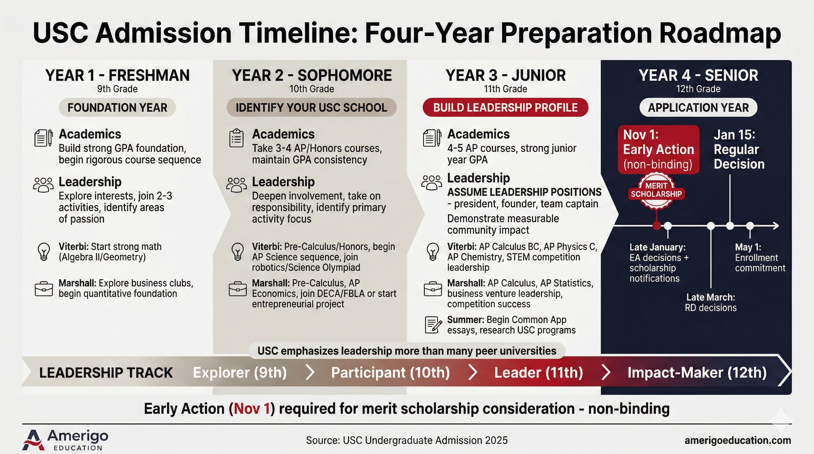 Students attending US high schools gain advantages through recognized transcripts, direct teacher recommendations, and demonstrated cultural integration. Programs like Amerigo that provide four-year academic planning, prerequisite course support, and structured university counseling help international students build the leadership-focused profiles USC expects.