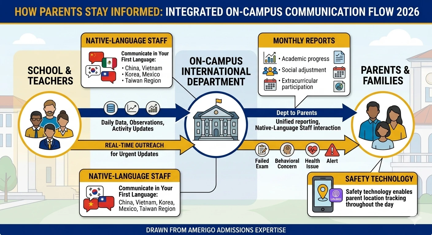 Programs with embedded staff at partner schools provide monthly reports covering academic progress, social adjustment, and extracurricular participation. Real-time outreach happens when updates require immediate attention - a failed exam, a behavioral concern, or a health issue. Native-language staff availability in countries including China, Vietnam, Korea, Mexico, and Taiwan Region means parents can communicate in their first language. Safety technology like Life360 enables parent location tracking throughout the day.