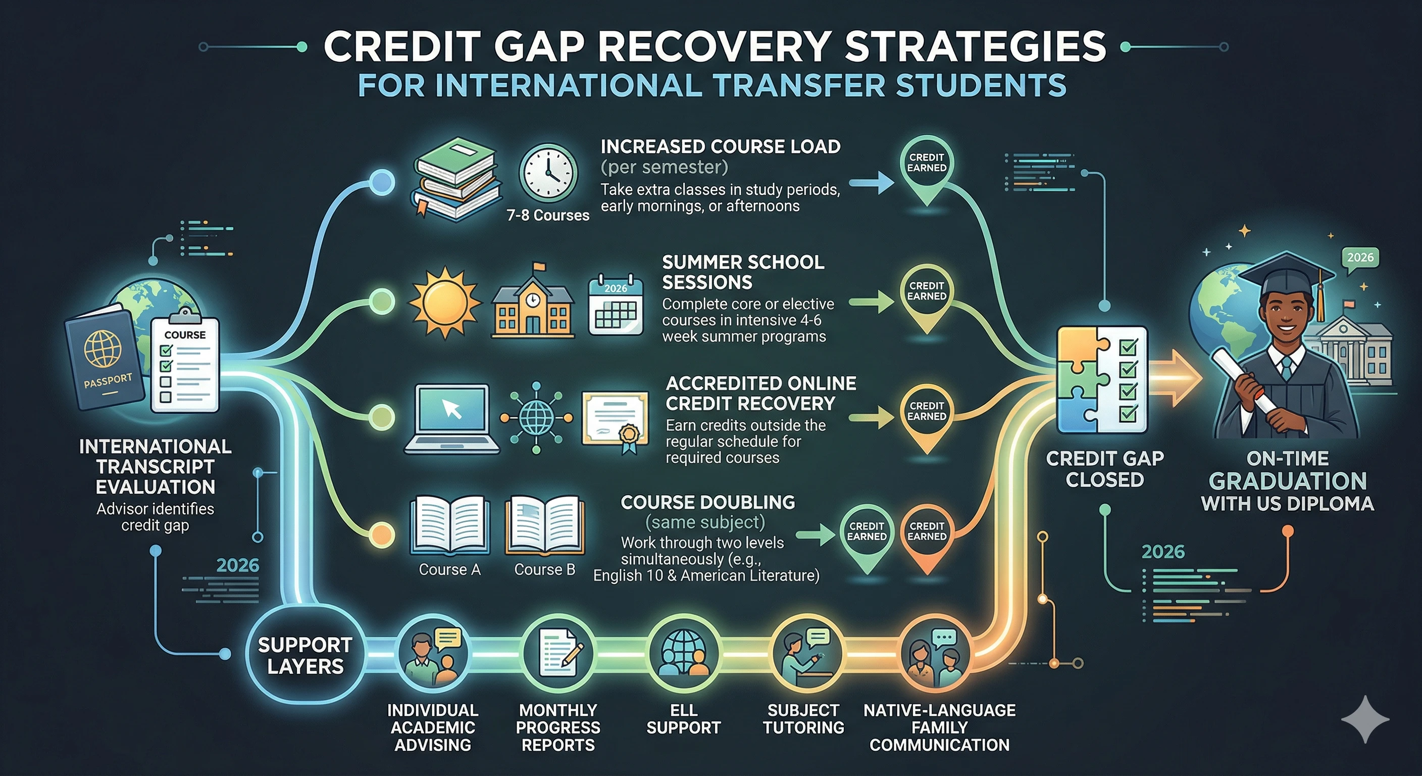 Students who enter a US high school at Grade 10 or 11 with fewer transferable credits than expected face a credit gap that must be closed before graduation. This is a planning challenge, not a barrier. Schools address credit gaps through several strategies that allow students to graduate on schedule without compromising academic quality.